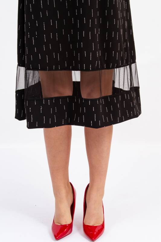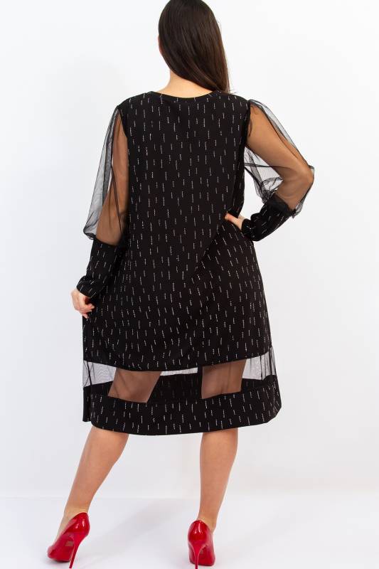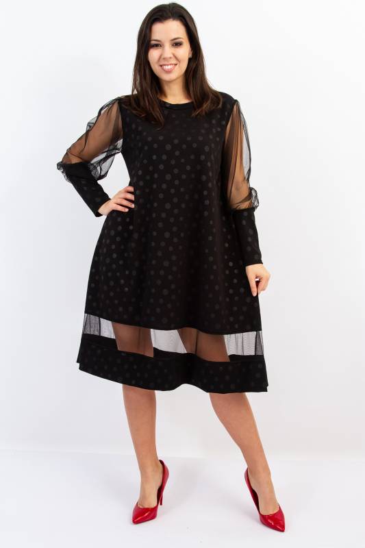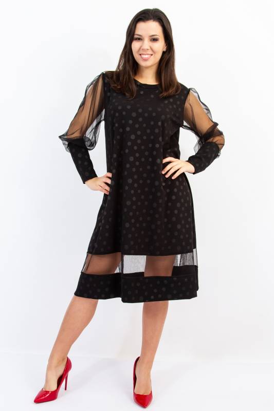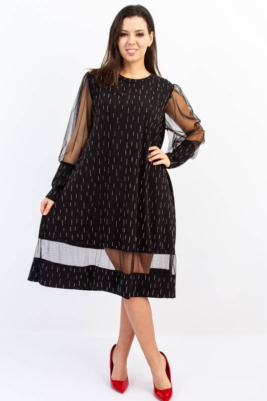 - Típus: A-vonalú egyedi mintával elegáns tüllbetétes szexi midi ruha mandzsettás tüllujjal