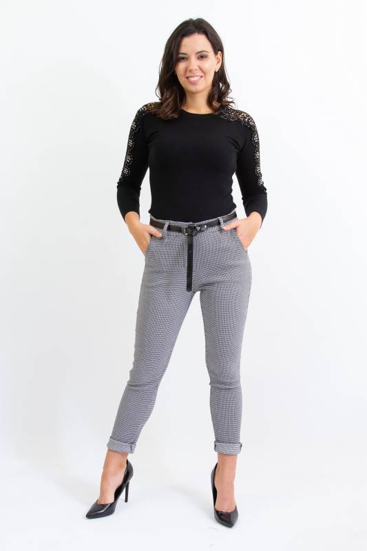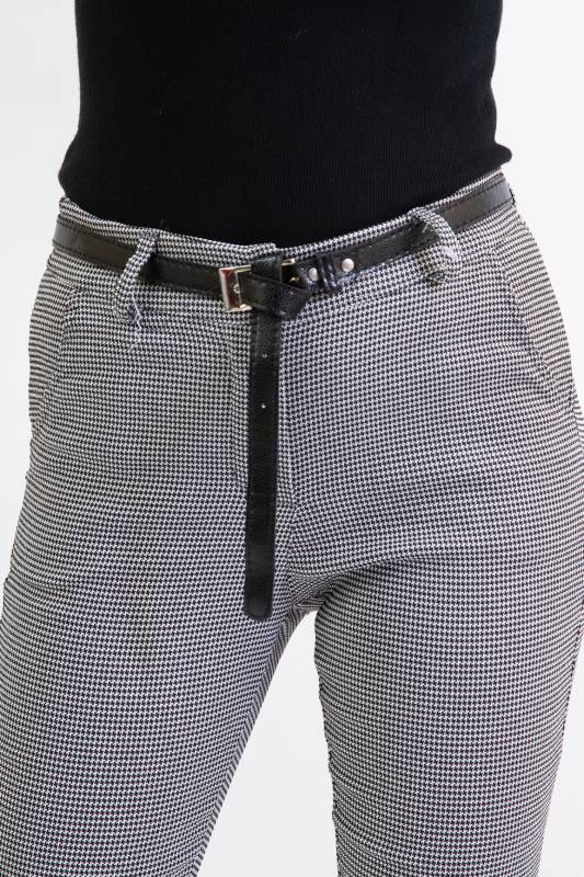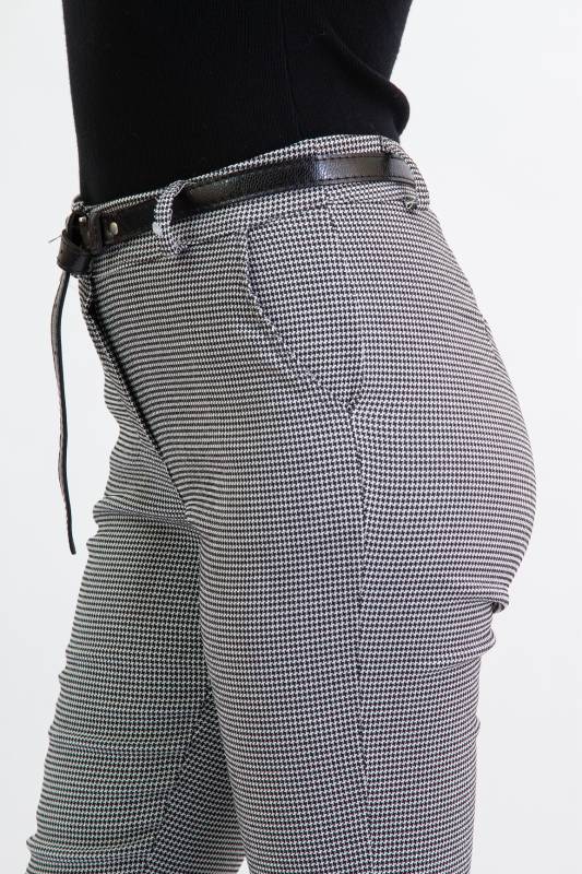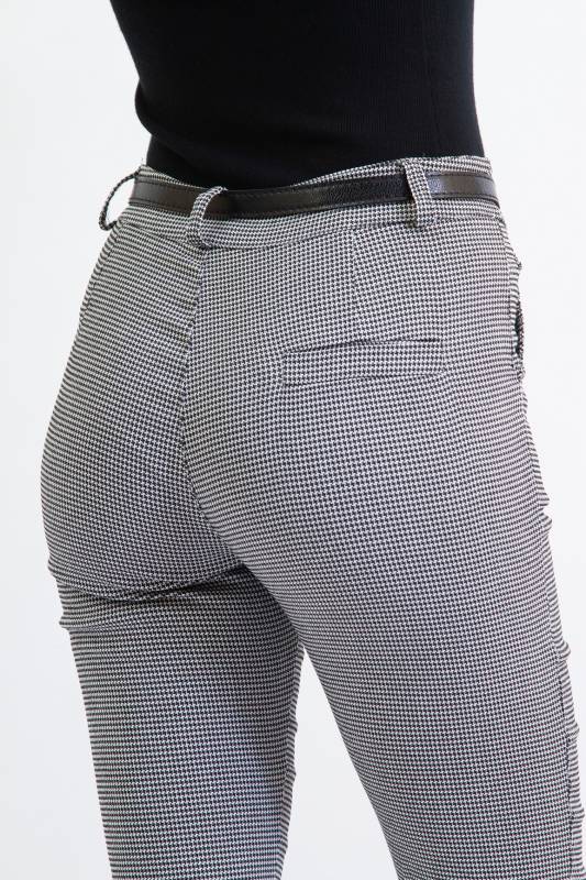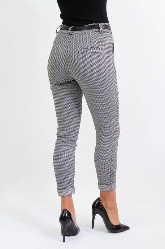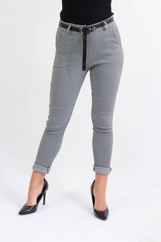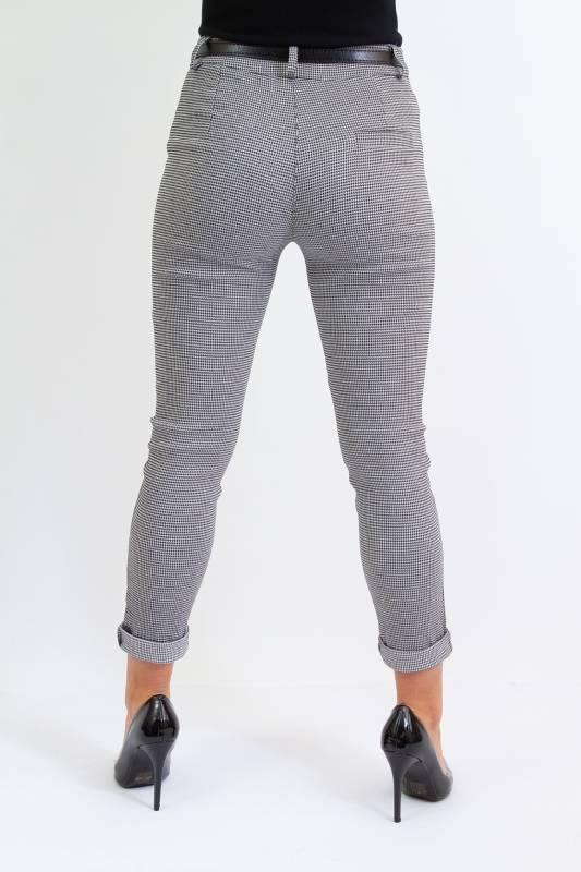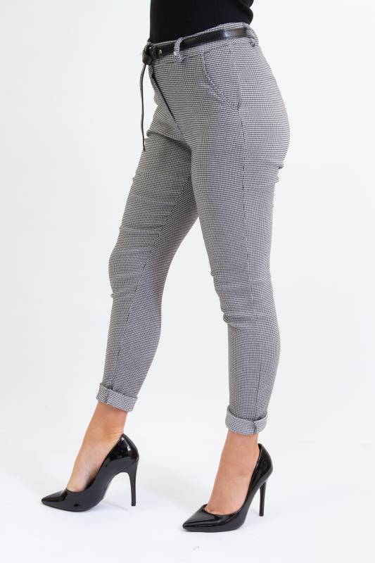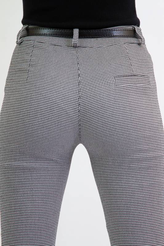 Alkalmi tyúkláb mintás sztreccses szűkített szárú női nadrág műbőr övvel