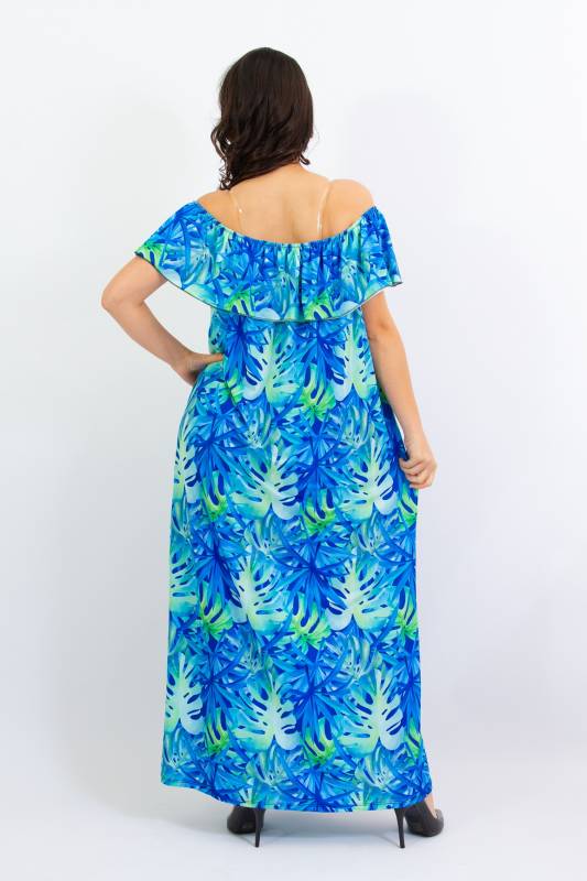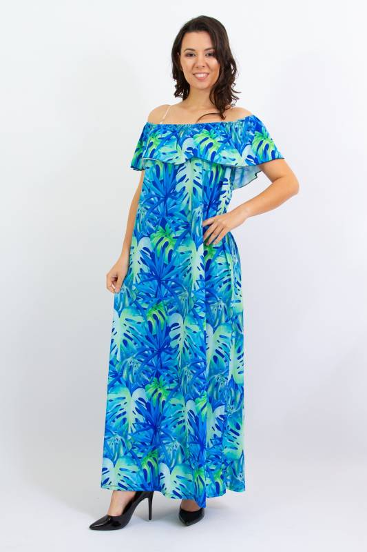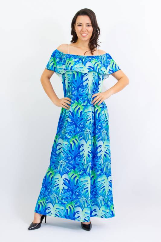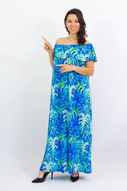- Típus: Alkalmi világos zöld trópusi mintás pelerines ujjatlan gumis vállú bő fazonú hidegselyem maxi ruha