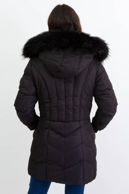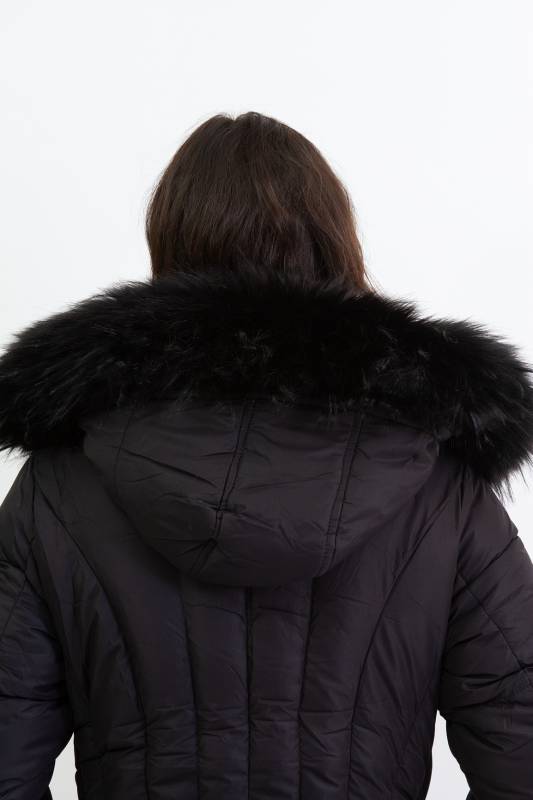 Divatos bélelt karcsúsított, hosszított steppelt női télikabát mandzsettas ujjal és szőrmés kapucnival