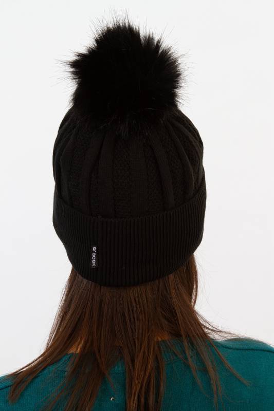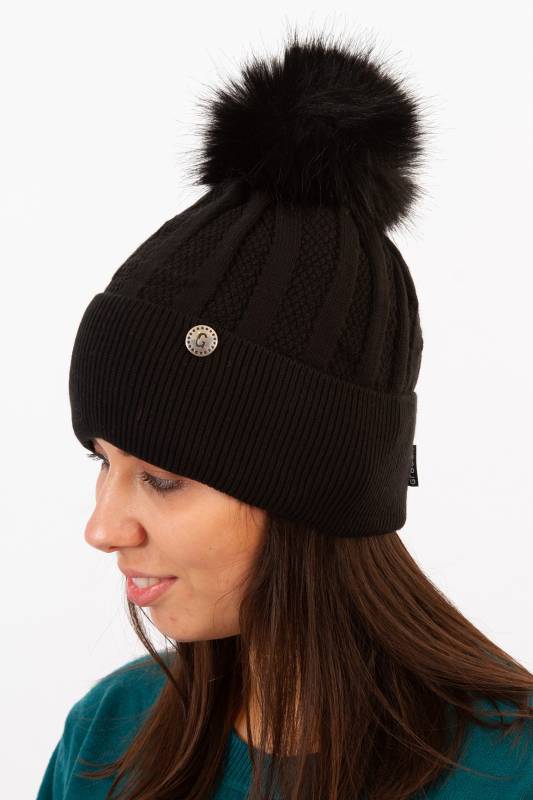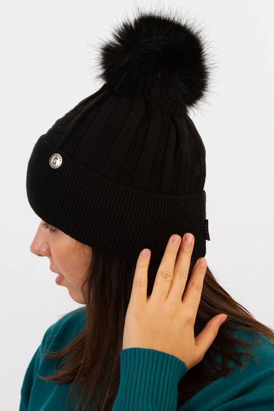 Divatos fekete bélelt gépi kötött téli sapka szőrme pompommal kerek emblémával