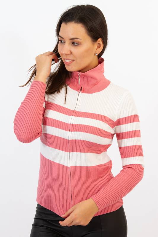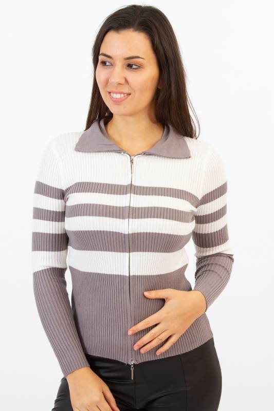 Divatos galléros cipzáros hosszú ujjú gépi kötésű csíkos kardigán