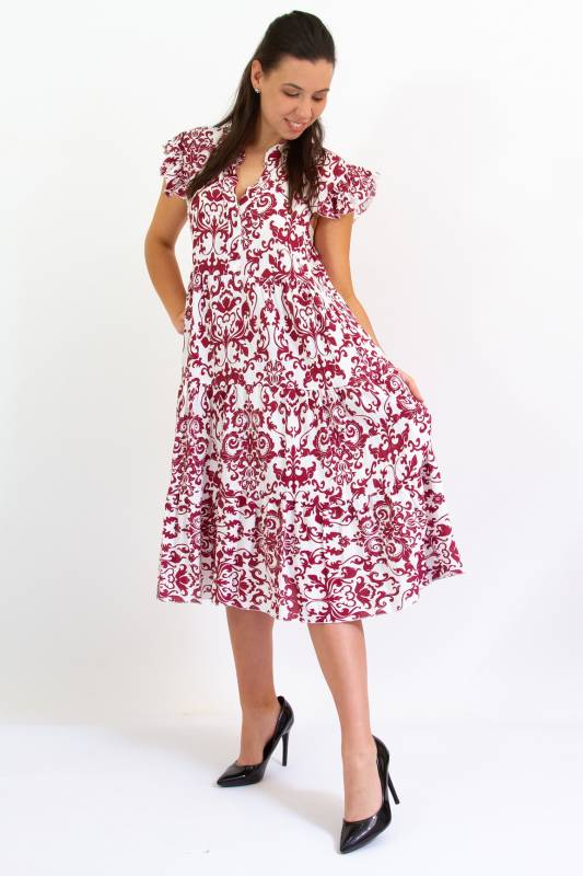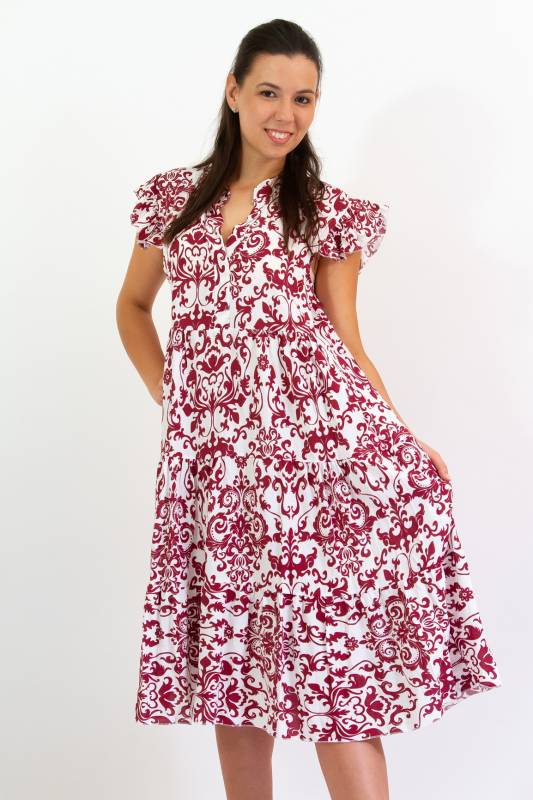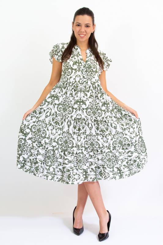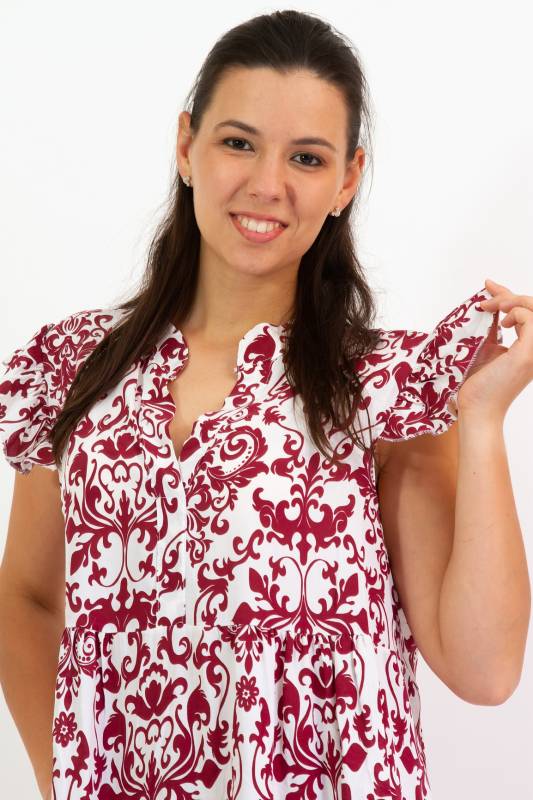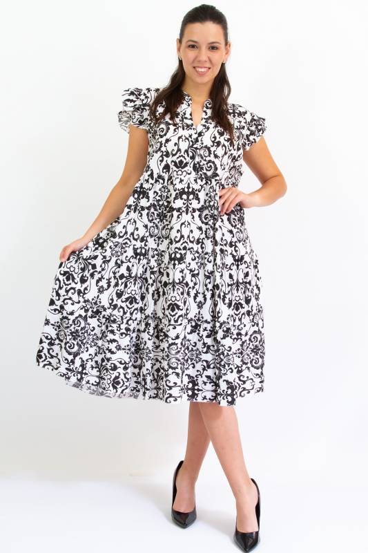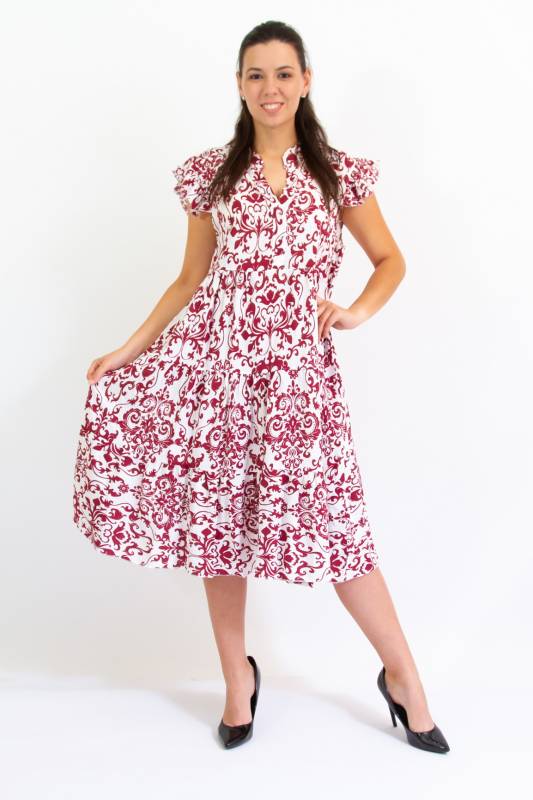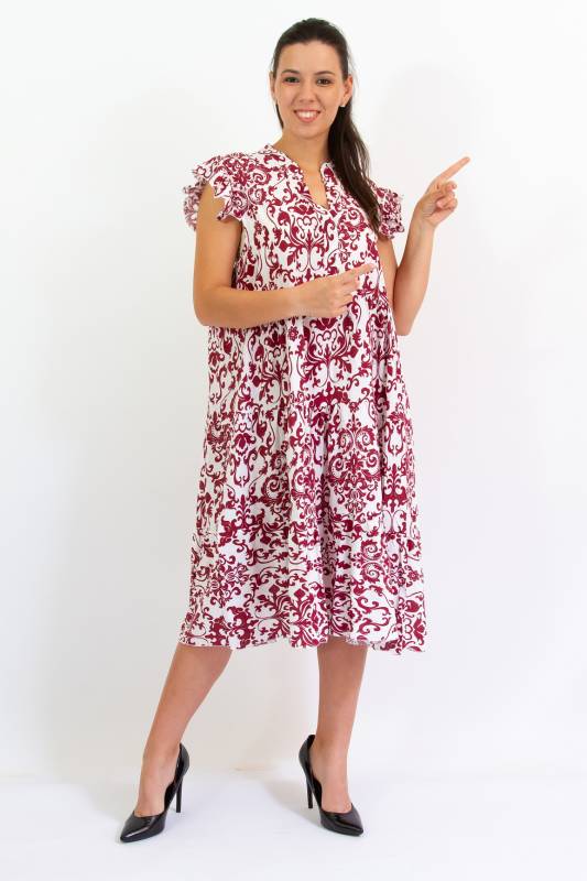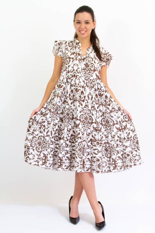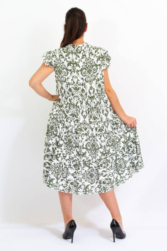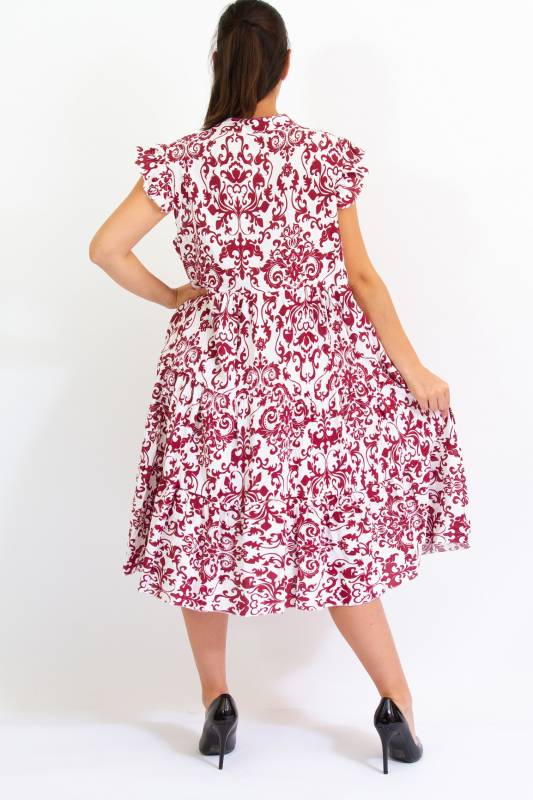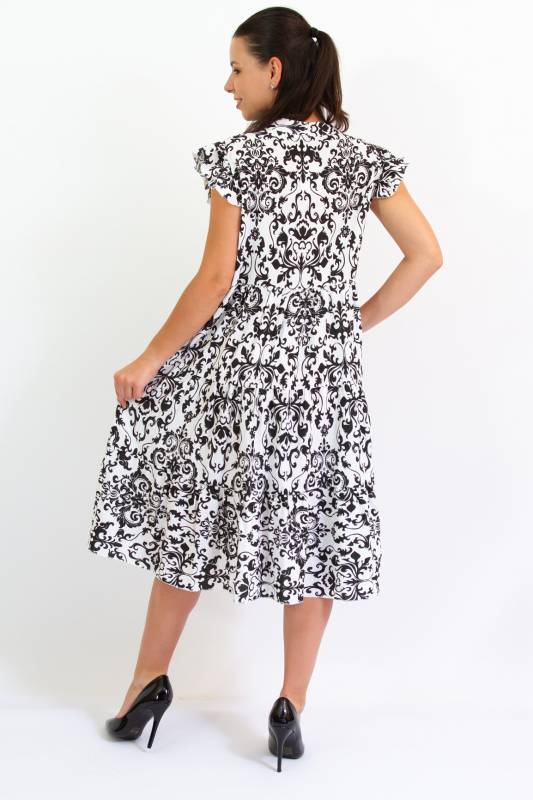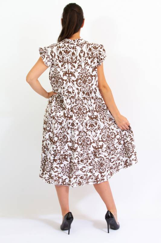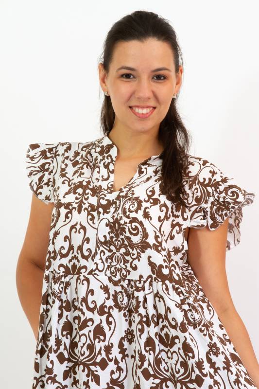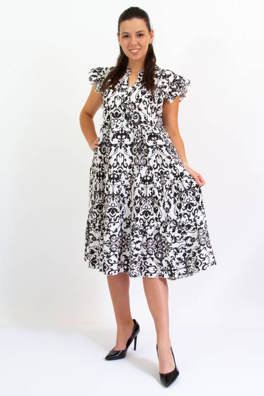 - Típus: Divatos ujjatlan fodros vállú damask mintás A vonalú V-nyakú miniruha