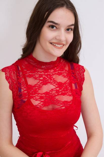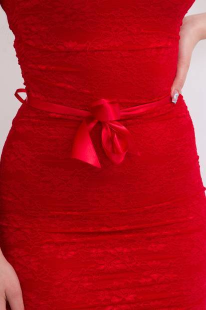 KIKIRIKI Alkalmi magas nyakú rövid ujjú csipke mini ruha derékban szalag megkötővel