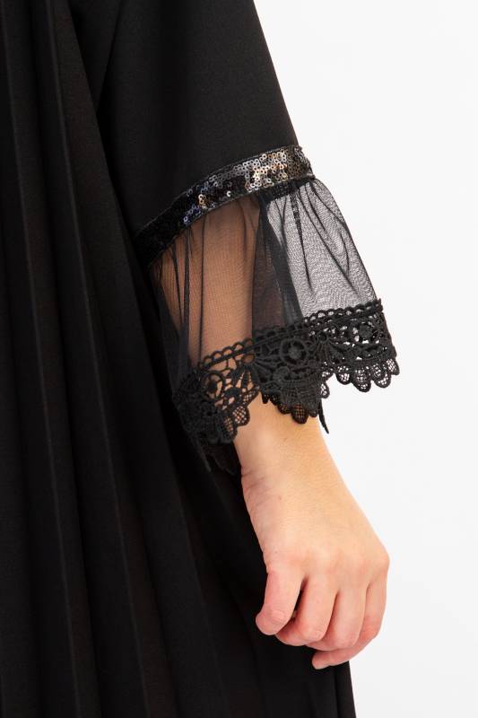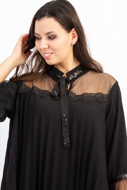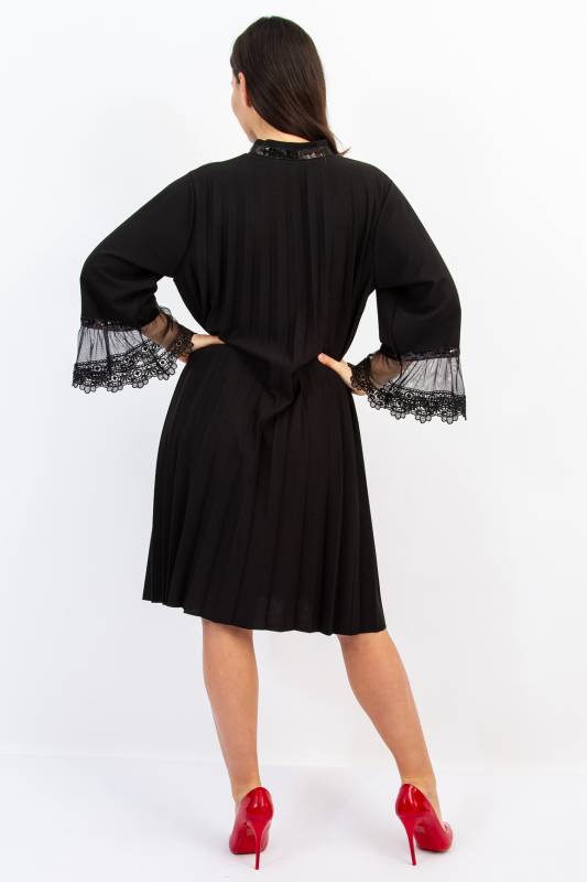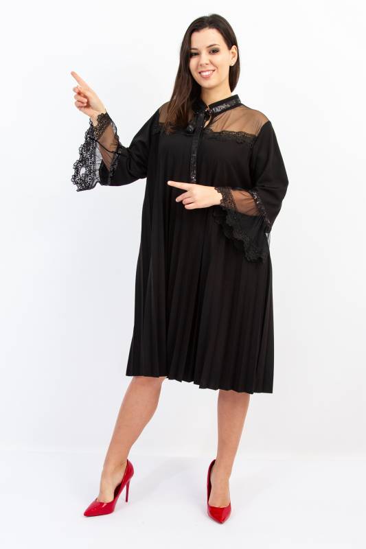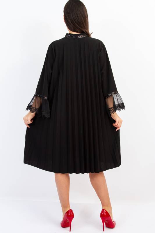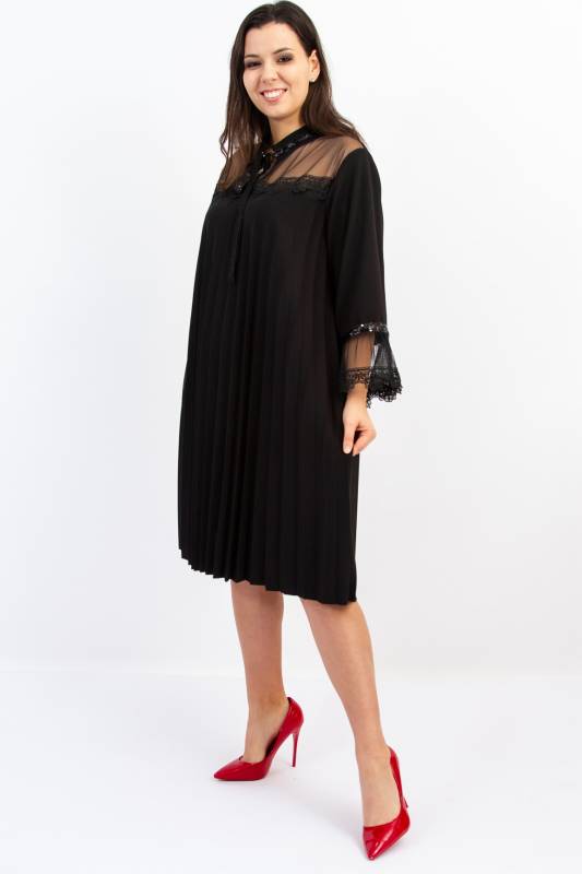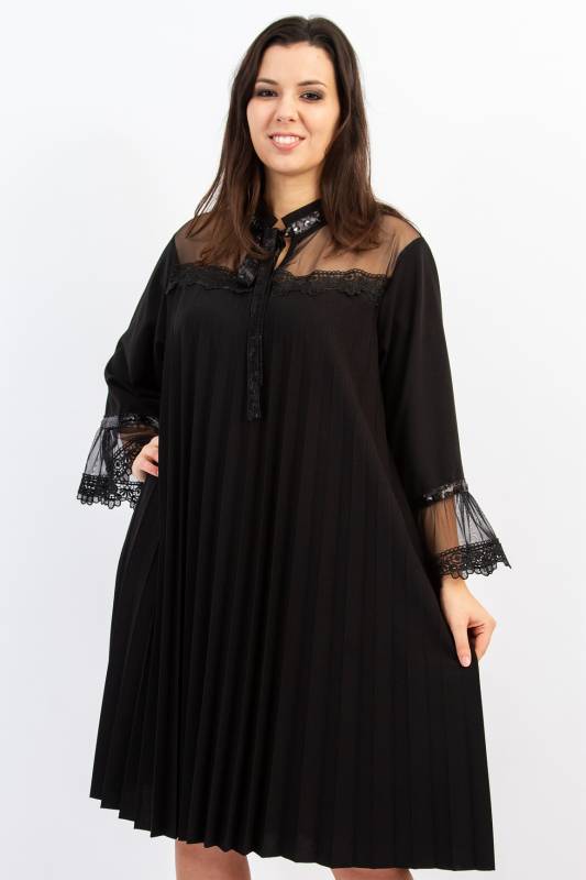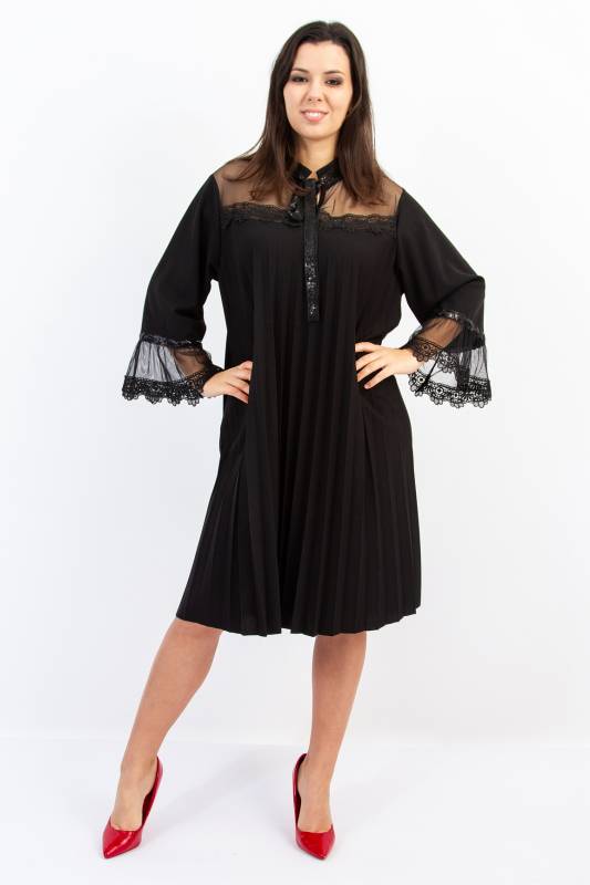 - Típus: Nagy méretű A-vonalú plisszírozott midiruha hímzett tüllbetétekkel, csipkés ujjvéggel és fényes megkötővel – fekete