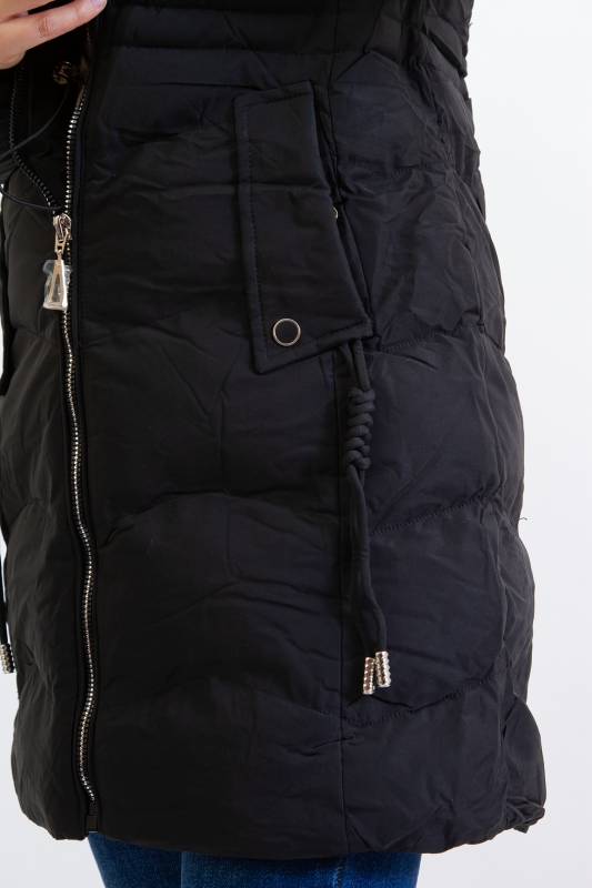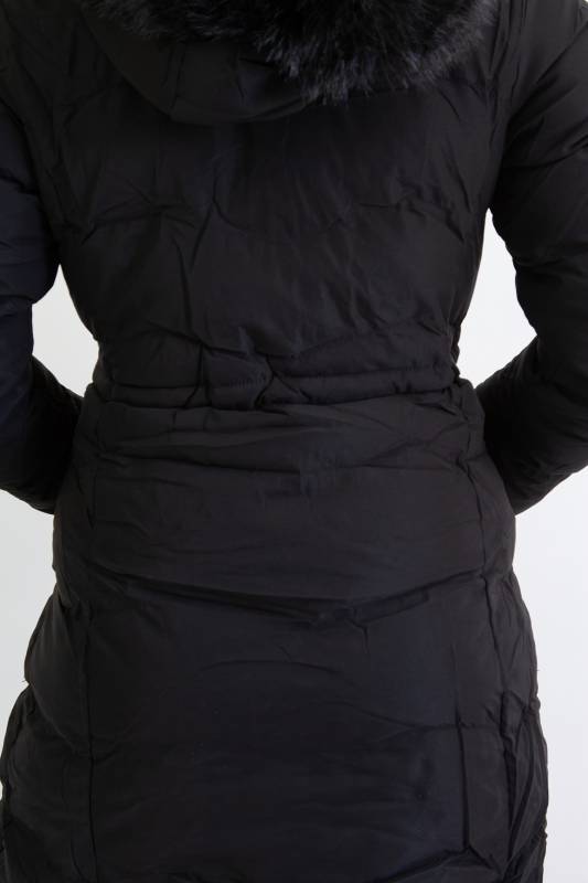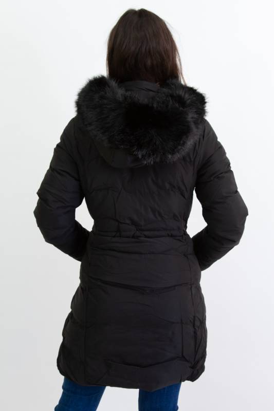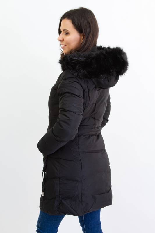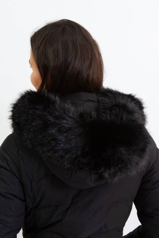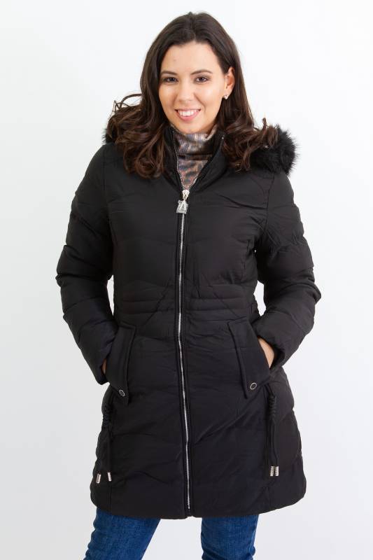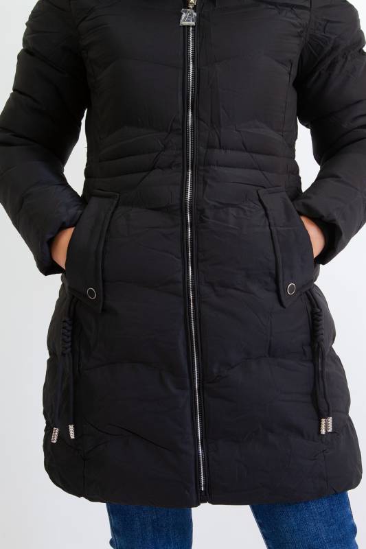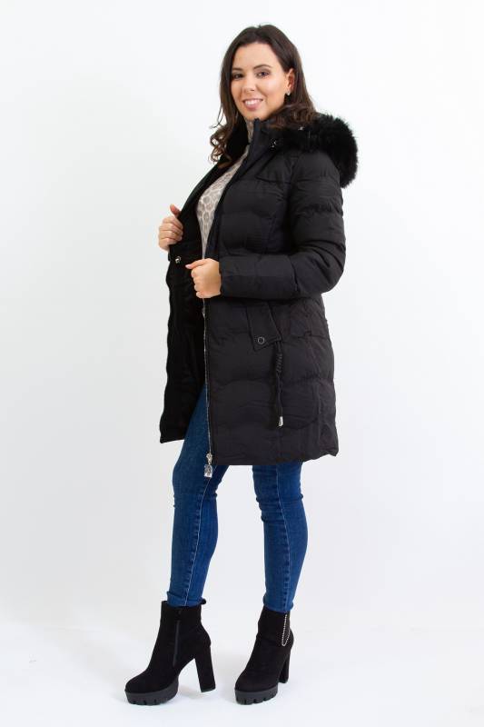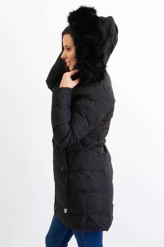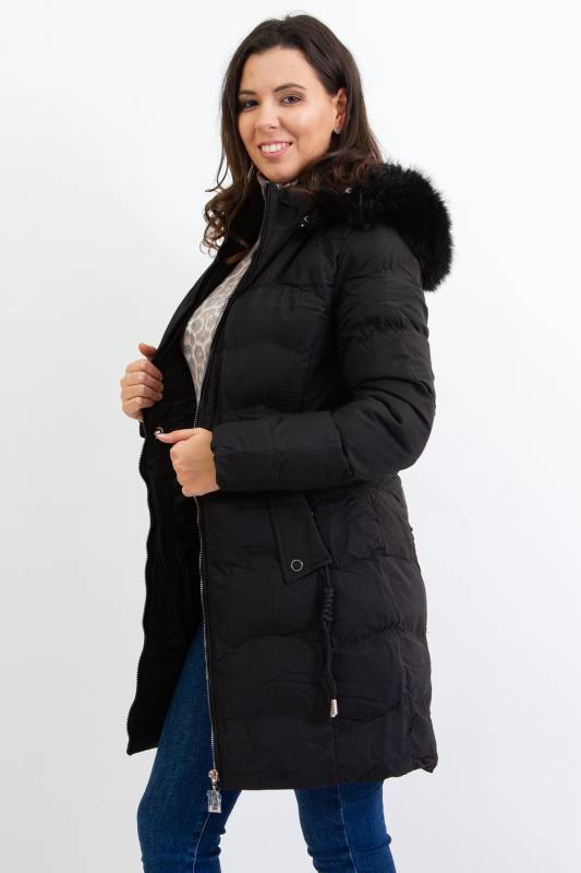NATURE divatos karcsúsított, hosszított steppelt női télikabát mandzsettas ujjal és szőrmés kapucnival