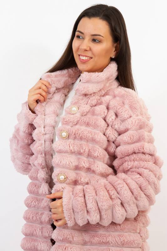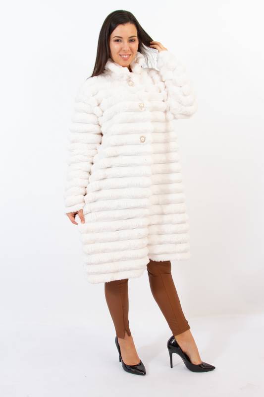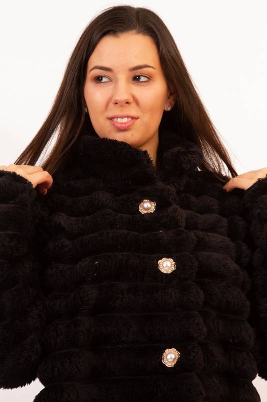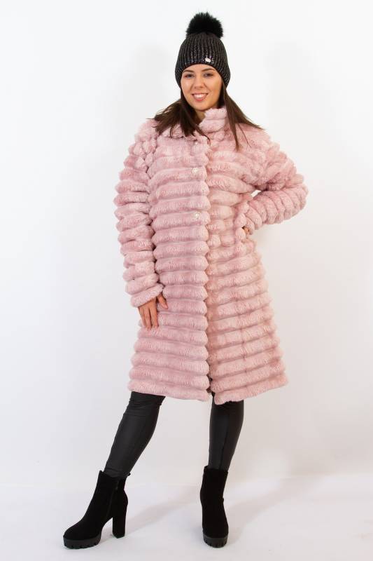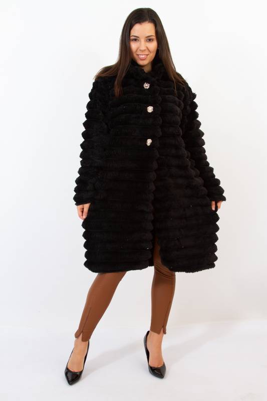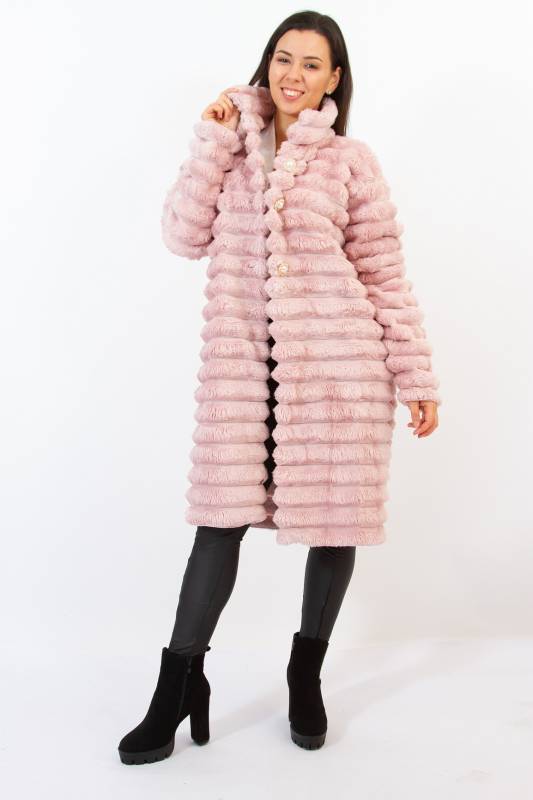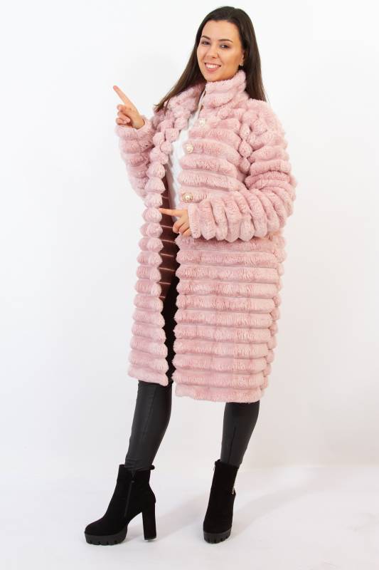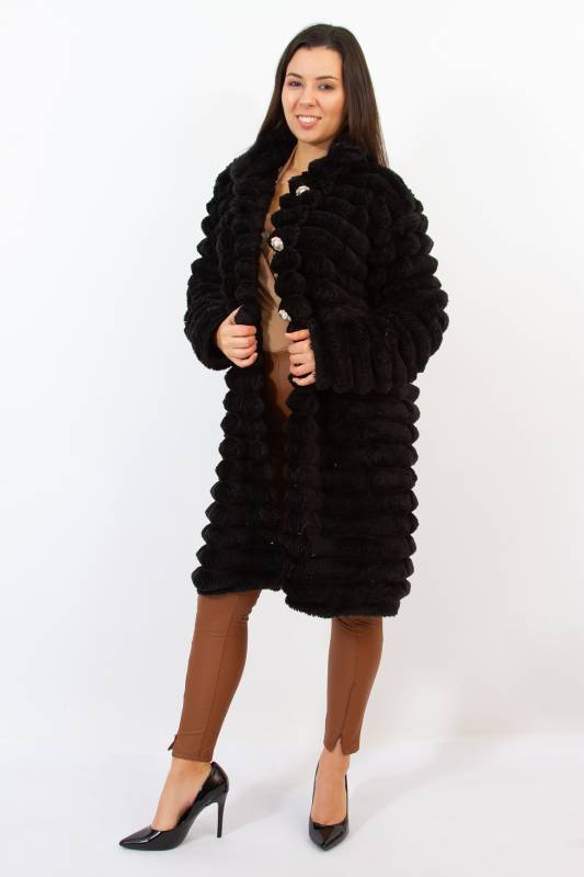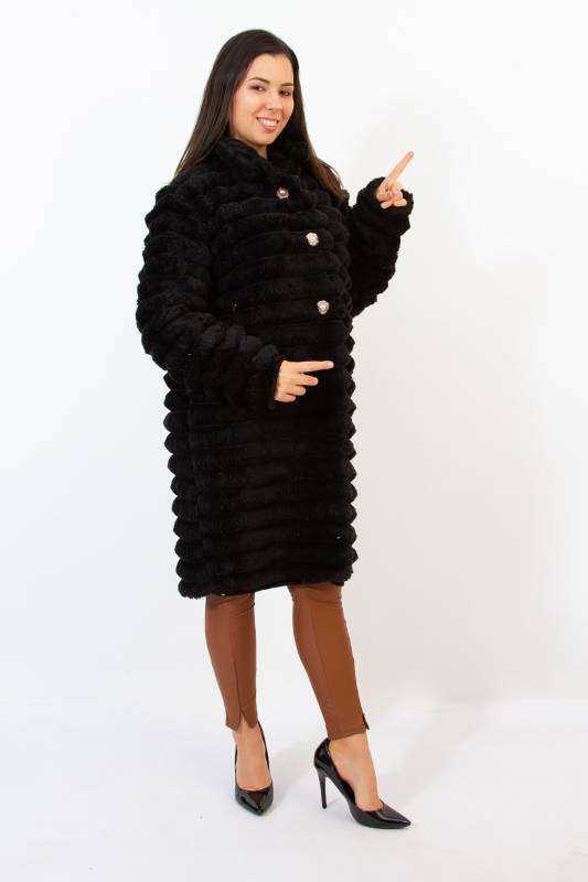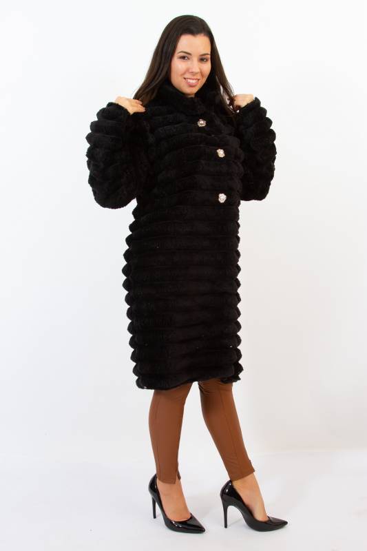 Női divatos hosszú műszőrme kabát bordazott stílusban dekorativ gombokkal