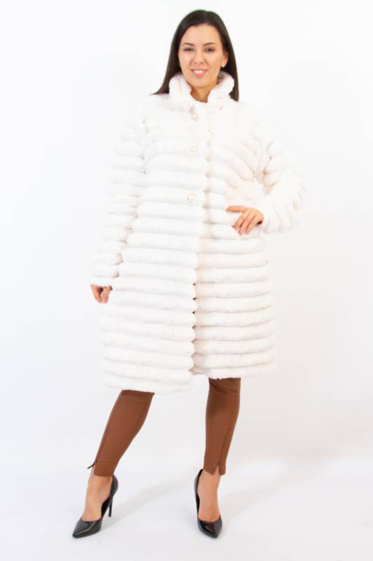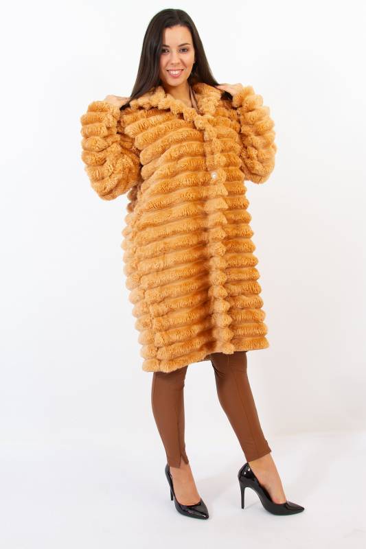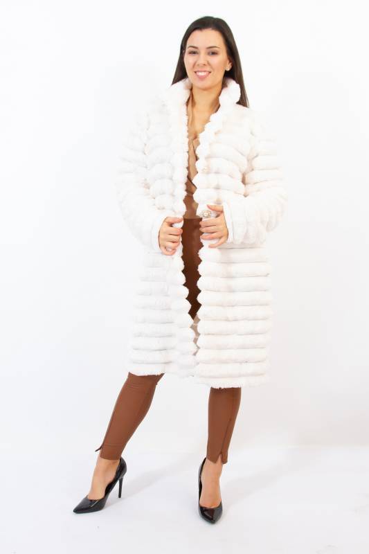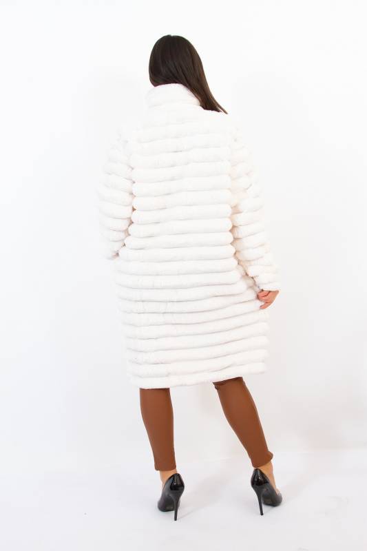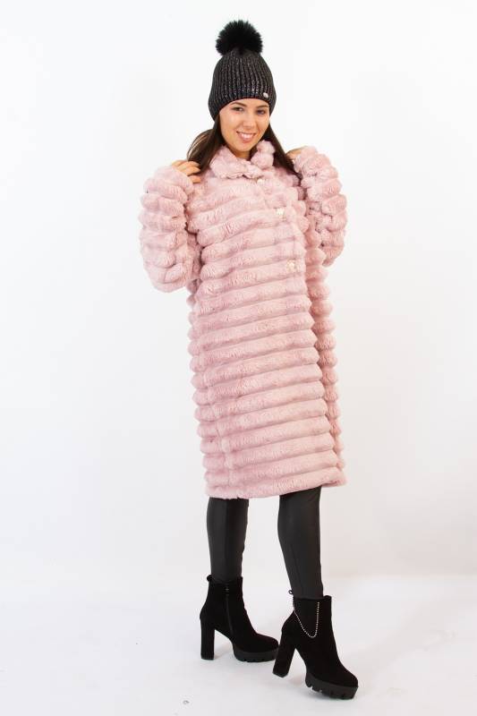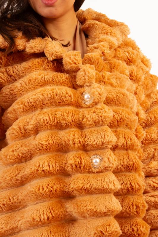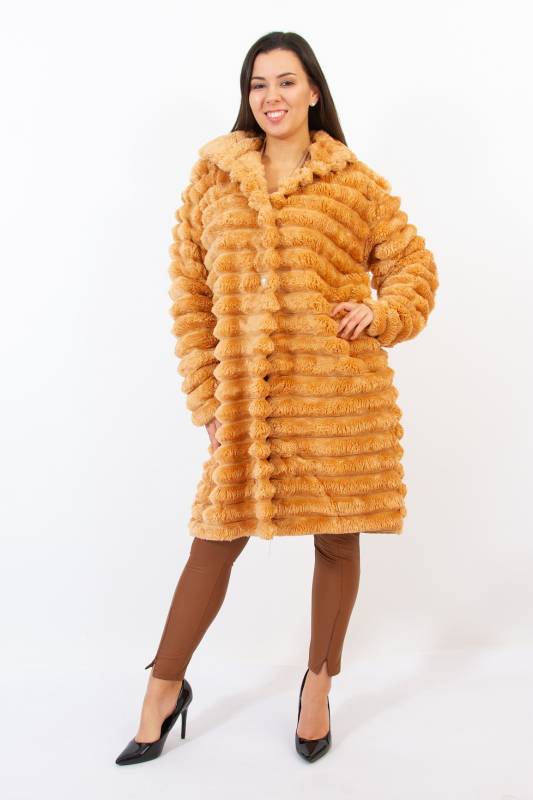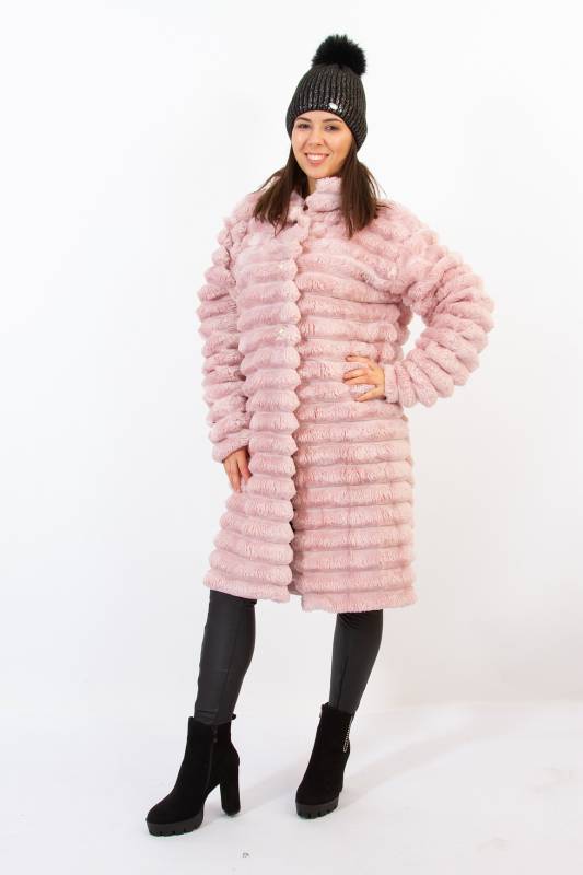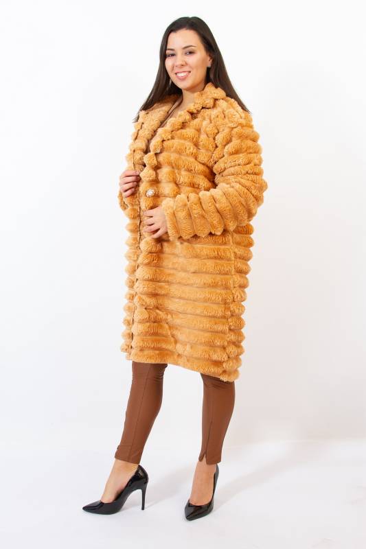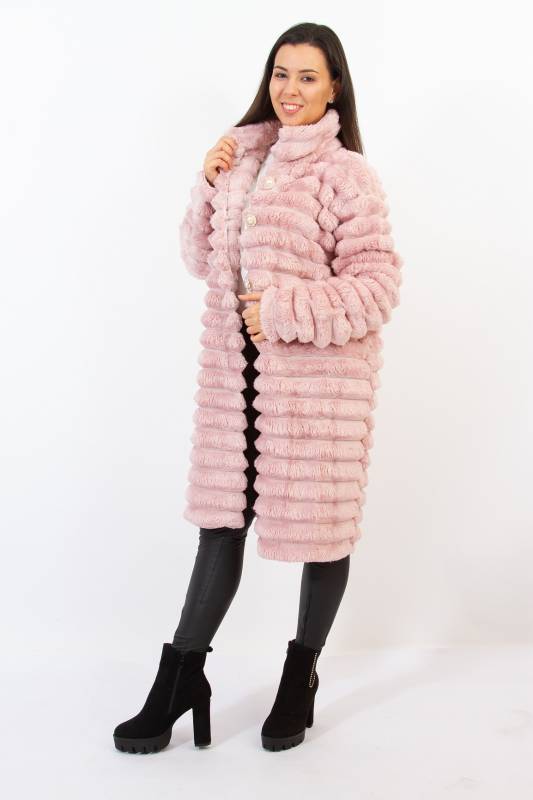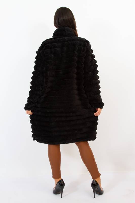 Női divatos hosszú műszőrme kabát bordazott stílusban dekorativ gombokkal