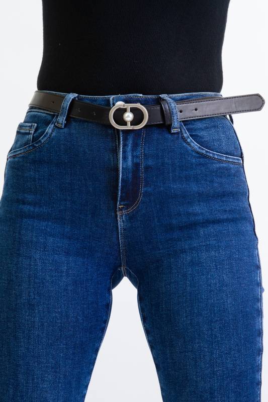 REDRESS Divatos szexipush up-os magasított derekú csőszárú női farmernadrág sötét barna övvel