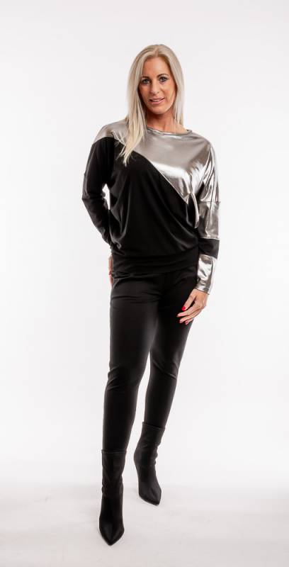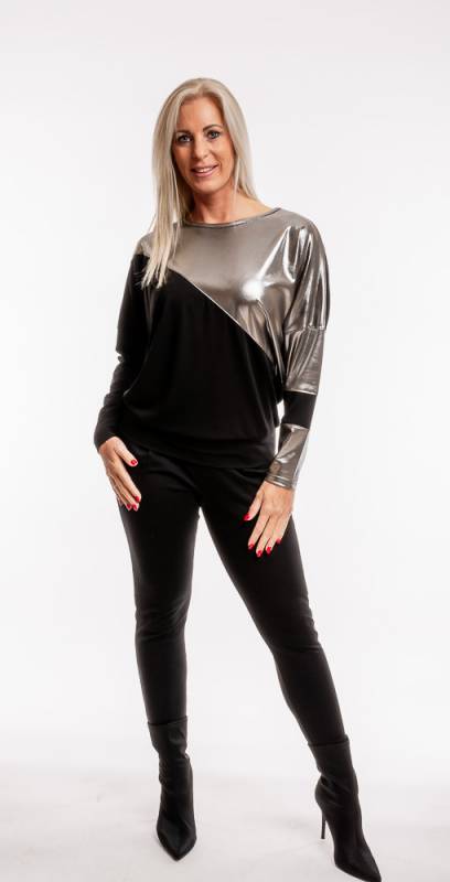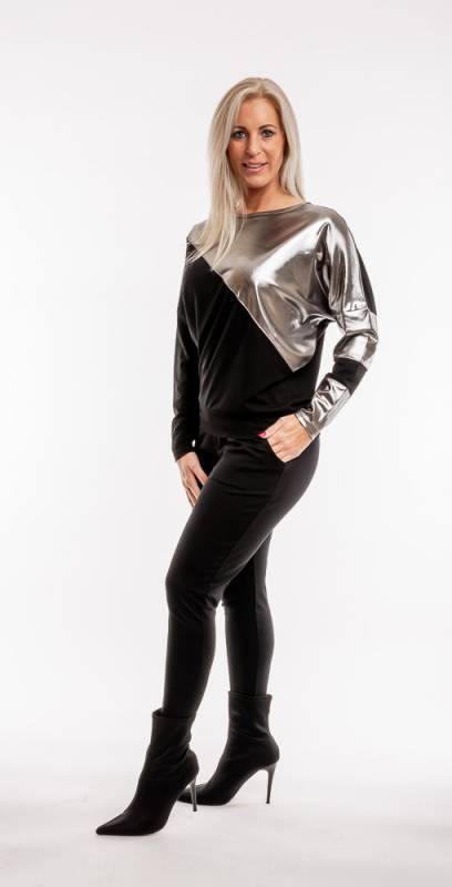 RUCY FASHION Hosszú ujjú formázott divatos passzés felső fekete-ezüst