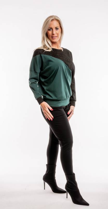 Ünnepi hangulatú hétköznapi felső. Modern elegancia, csillogó részletek. Kontrasztos megjelenés kombinációja elegáns megjelenést nyújt.