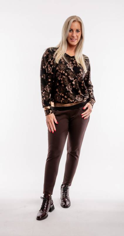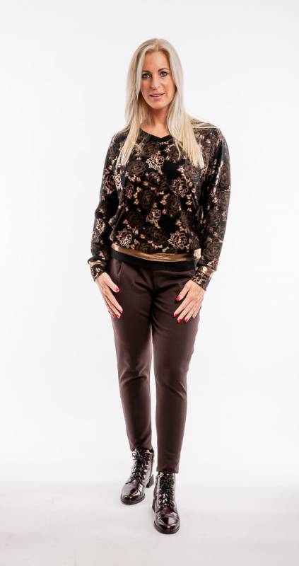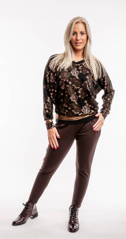 A pulóver laza, V-nyakú ejtett vállú fazonú, csillogó szegélyekkel az ujjavégeken és a derékrészen. Fekete alapon bézs és bronz enyhén csillogó virág minta díszíti.