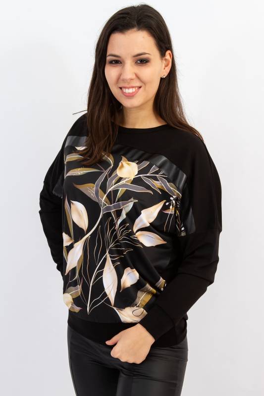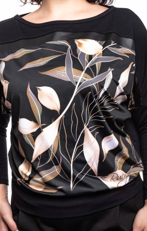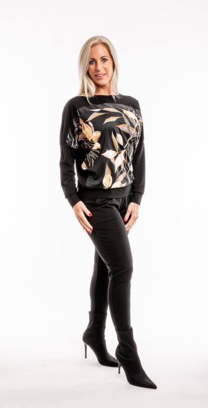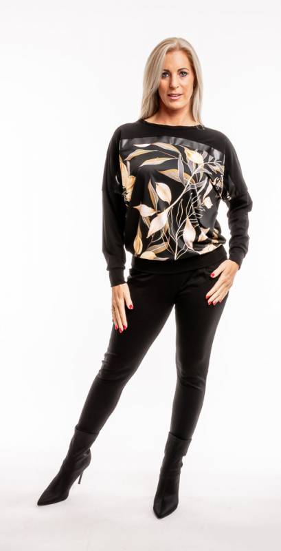 Hosszú ujjú, passzés aljú felső, dekoratív light gold levél mintával. Rugalmas, puha, sztreccses anyaga kényelmessé és esztétikussá teszi a ruhát, a dekoratív műbőr betétes díszítése pedig izgalmas megjelenést ad neki. Kényelmes és elegáns viselet karácsonykor, az ünnepekre, különleges alkalmakra vagy hétköznapokon
