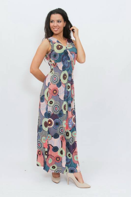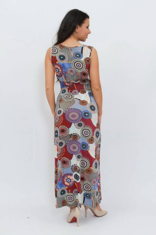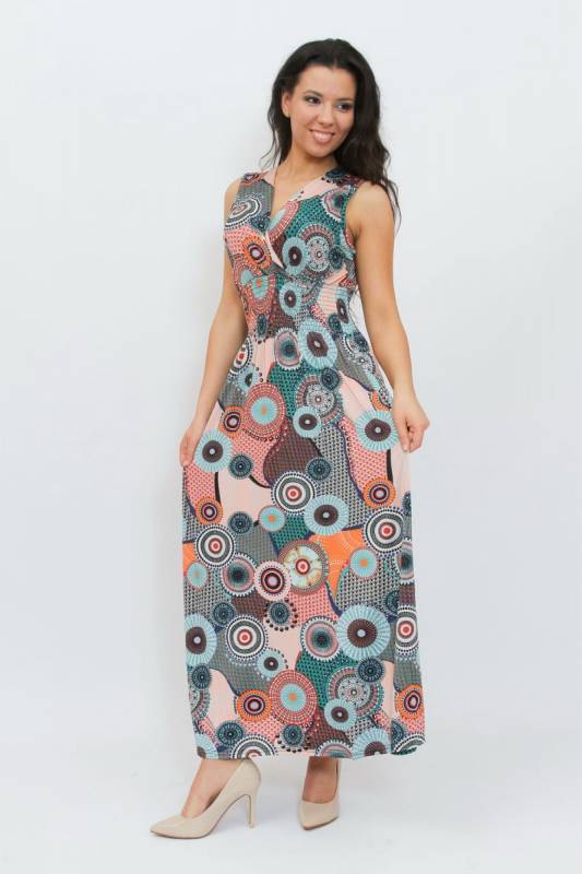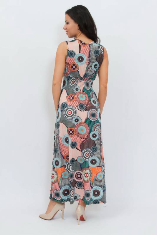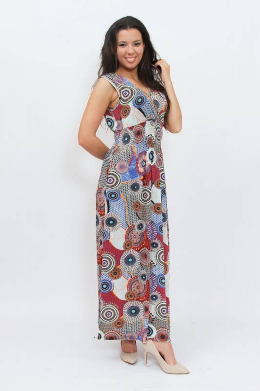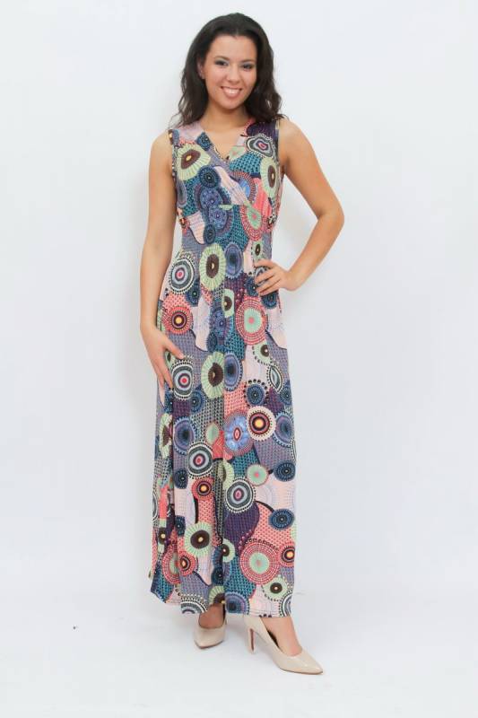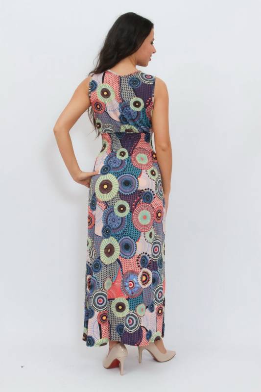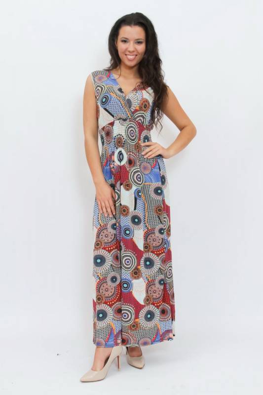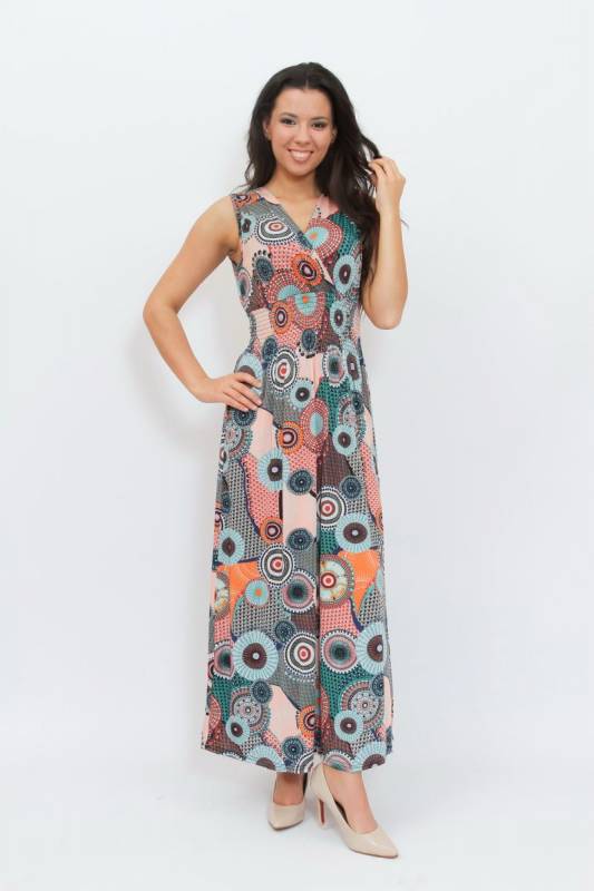 Stílusos színes egyedi mintával díszített átlapolt gumis derekú ujjatlan női maxi ruha