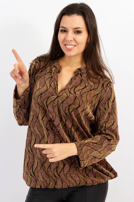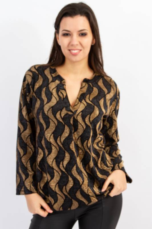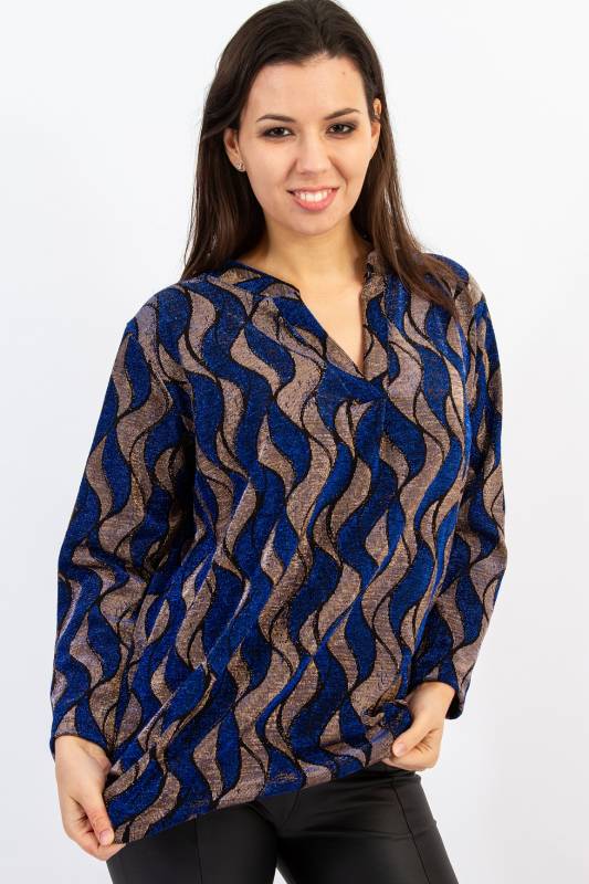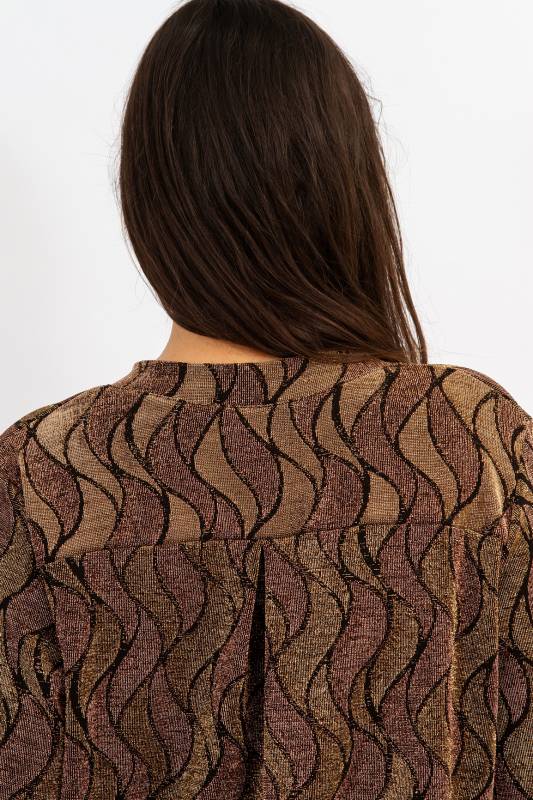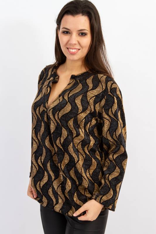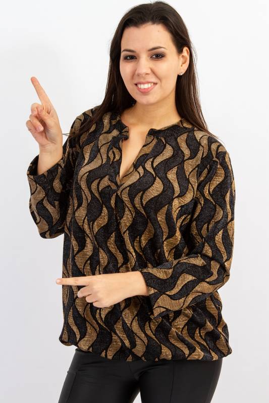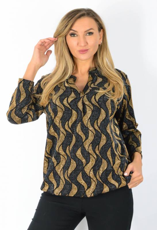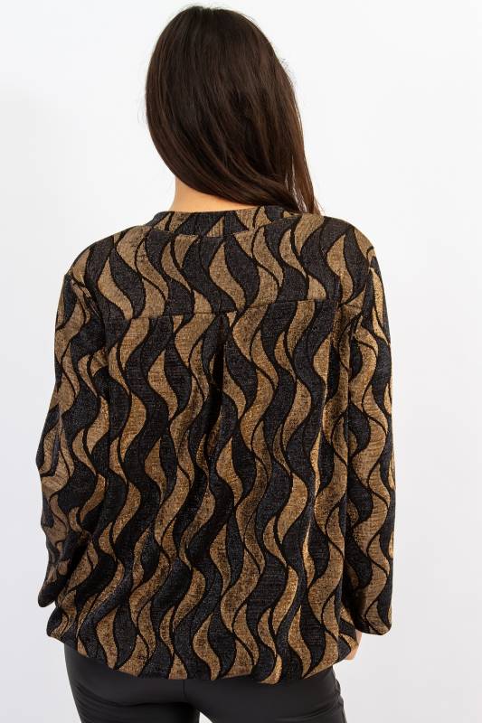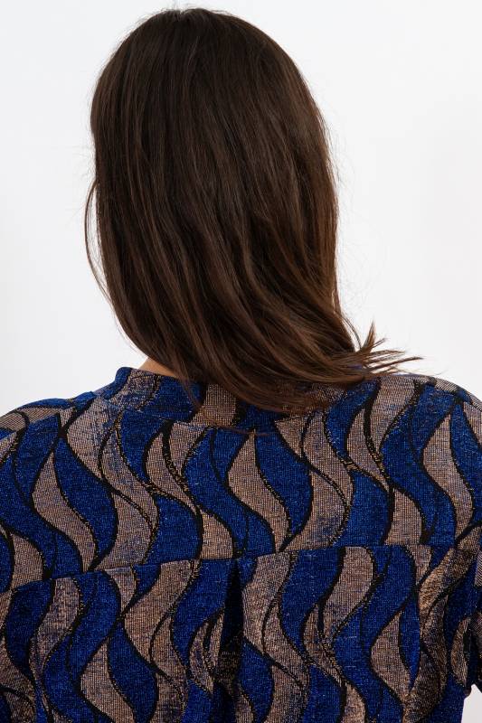 Ünnepi hangulatú hétköznapi felső. Modern elegancia, fenyes mintás. Kontrasztos megjelenés kombinációja elegáns megjelenést nyújt.