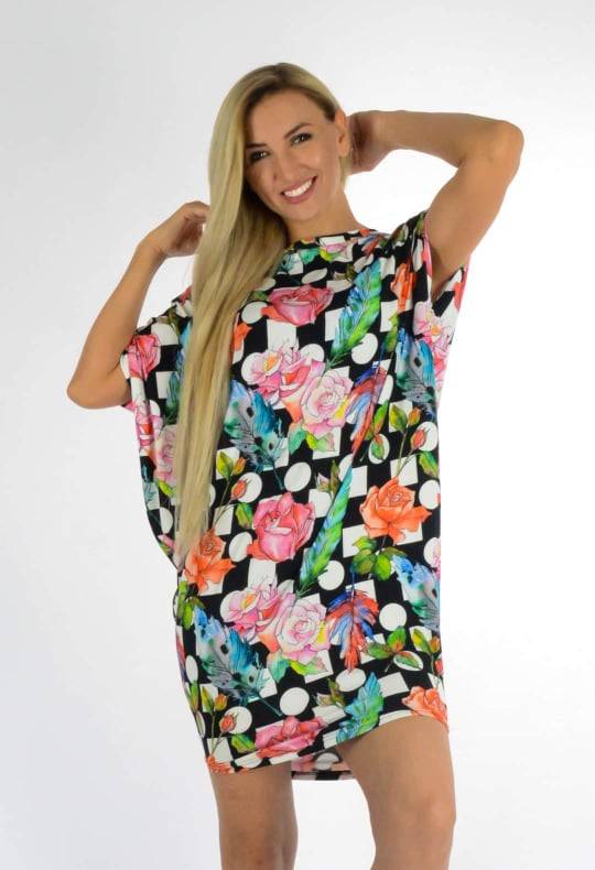 YESSTORY stílusos anyagában színes rózsa és levél mintás fekete alapon fehér kocka és kör mintával díszített női tunika/ miniruha